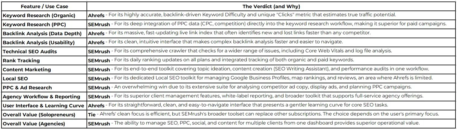 - Verdict: This is an overwhelming victory for SEMrush. Its superiority across content marketing workflows, PPC, social media, and local SEO is the single greatest differentiator between the two platforms.