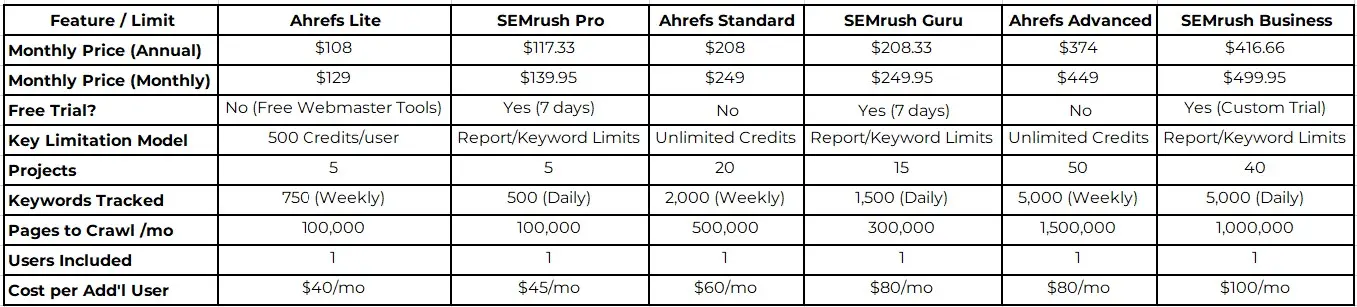 - Core Plans: The sticker prices for the main tiers are comparable. SEMrush plans are Pro ($139.95/month), Guru ($249.95/month), and Business ($499.95/month). Ahrefs plans are Lite ($129/month), Standard ($249/month), and Advanced ($449/month), reflecting recent price increases. Both offer a discount of around 17% for annual billing.