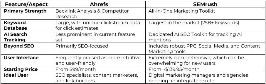 For a deeper comparison, read our full guide: Ahrefs vs. SEMrush: An Unbiased Showdown.